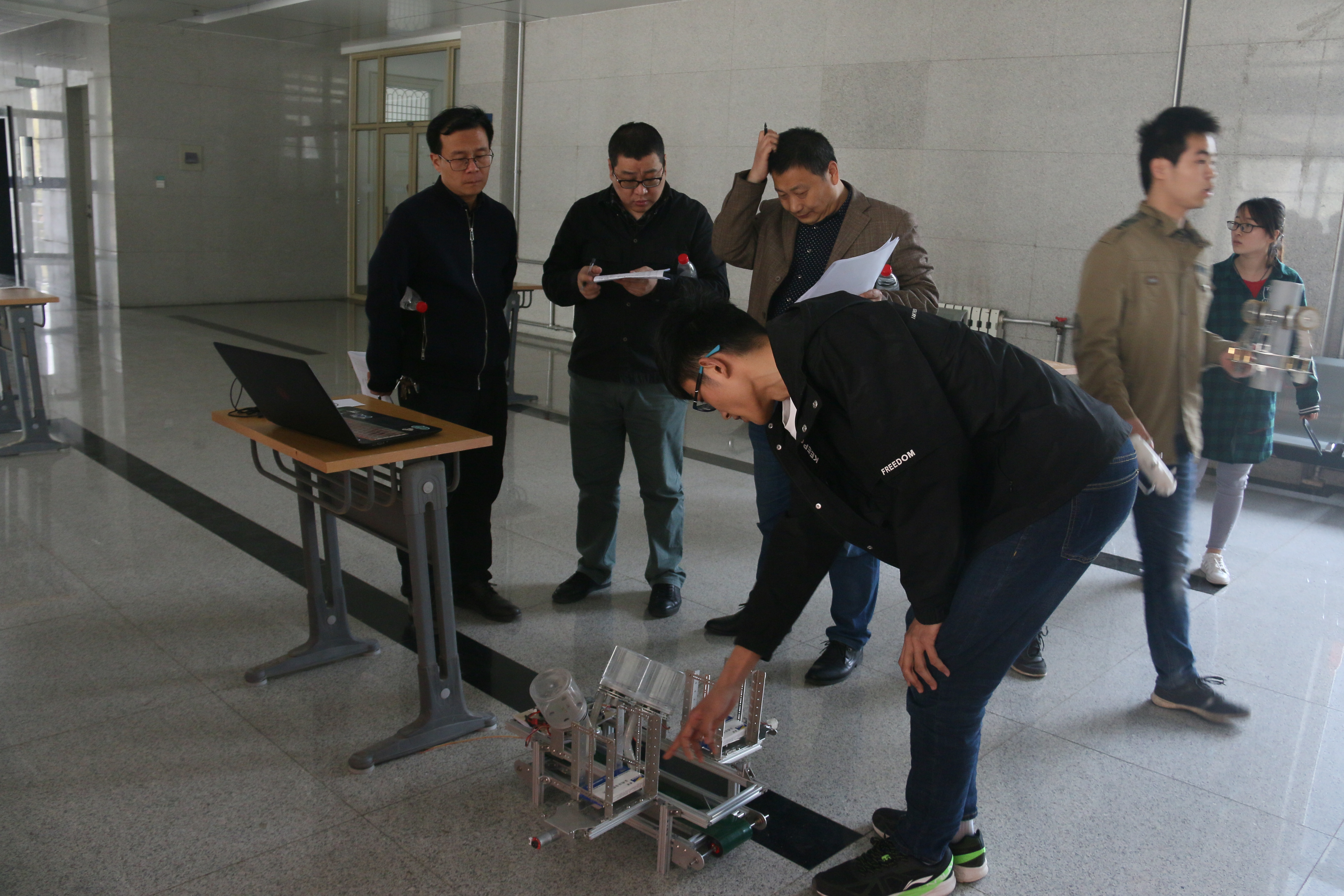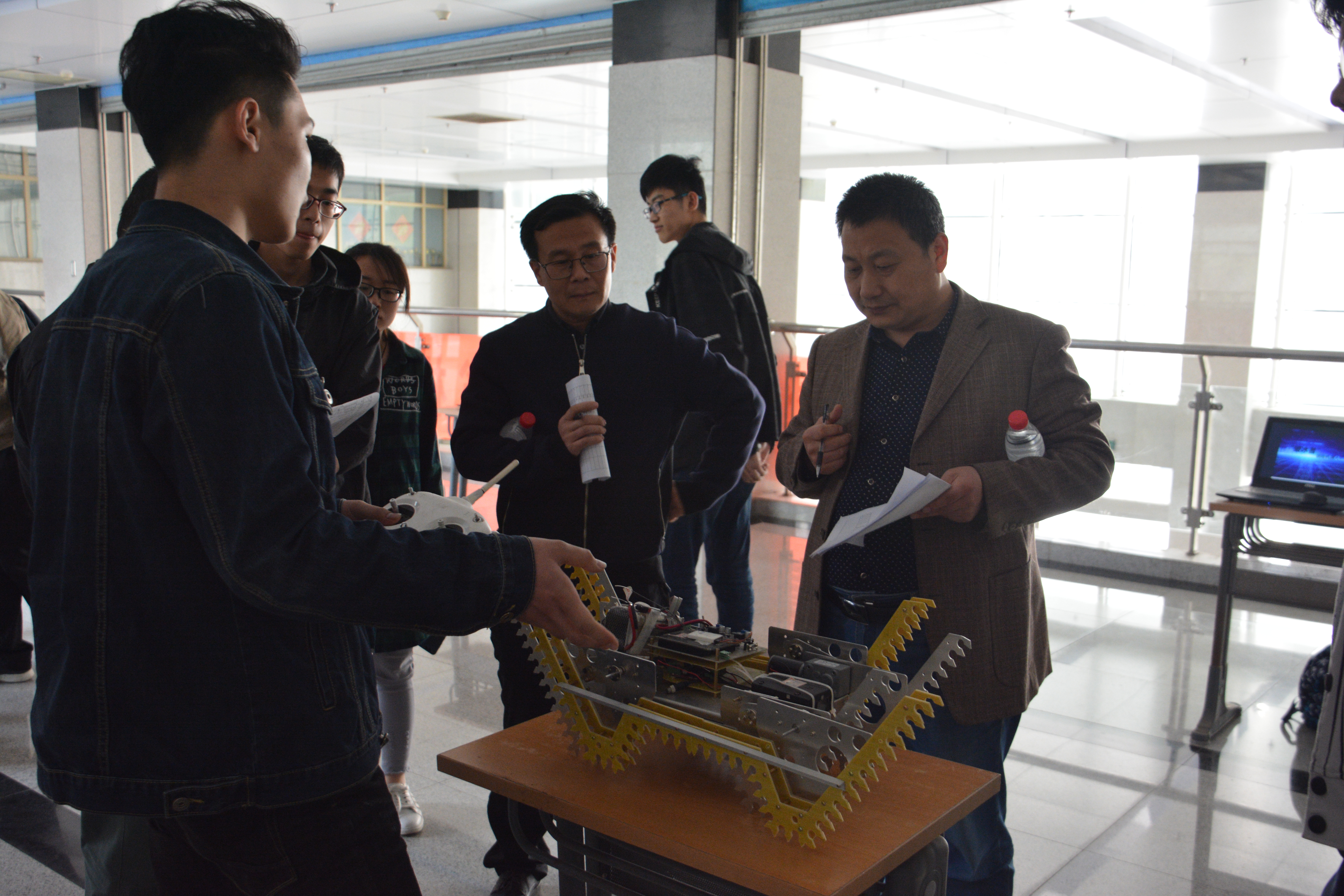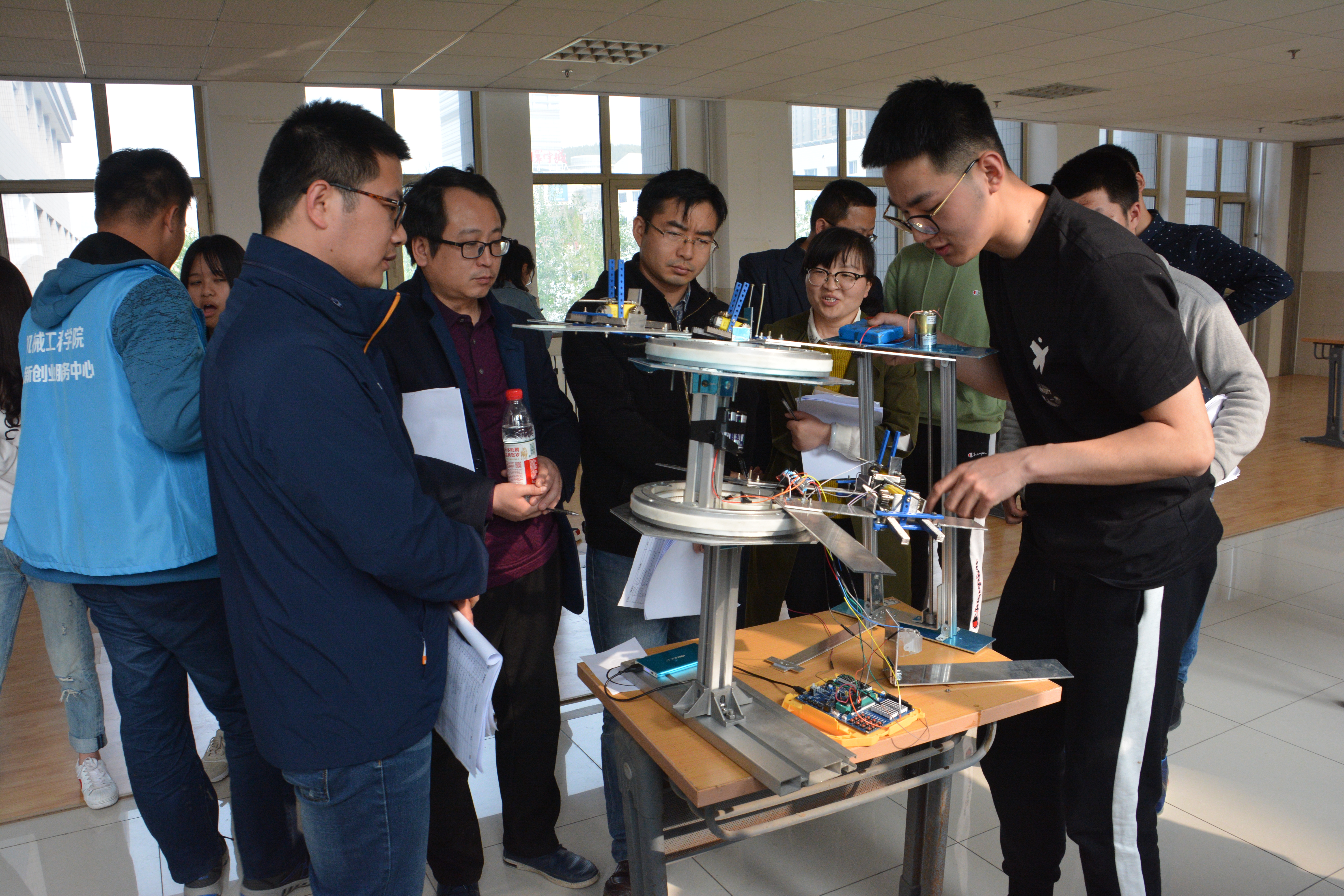 比赛下午两点开始,所有组签到地点统一在机械楼一楼大厅,省赛一组在机械楼二楼b区大厅答辩,省机电二组在四楼b区大厅答辩,国赛+企业组在五楼b区大厅答辩。比赛过程中,评委老师耐心解说、提出不足,选手们听取建议、做出改进。在省赛一组的比赛中,陶泥3D打印机制作精巧,外形美观。百变助力金刚——多功能便携搬运平台,方便实用,可靠性高。智能环保粉笔擦则能够为老师们创造一个更加清洁的教学环境。在省机电二组的比赛中,智能浇灌机器人通过新颖的创意弥补了传统浇灌模式中的不足。而在国赛+企业组比赛中,樱桃采摘机与采摘樱桃辅助工具两项作品则相辅相成、经济适用的能力与作用从其他产品中脱颖而出。经过最终的层层挑选,共有13项作品获得大赛一等奖,21项作品获得大赛二等奖,另有36项作品获得大赛三等奖。