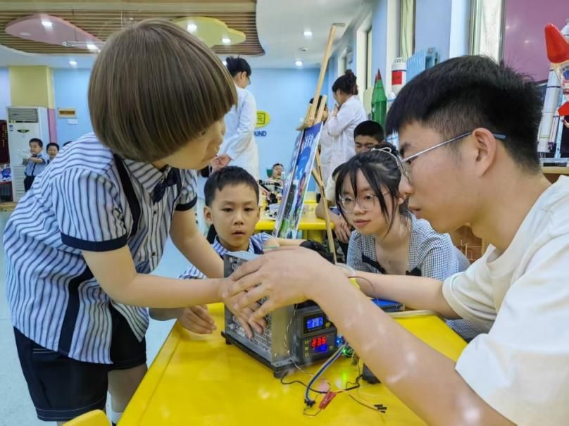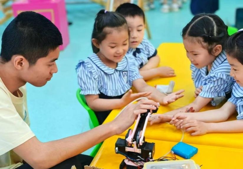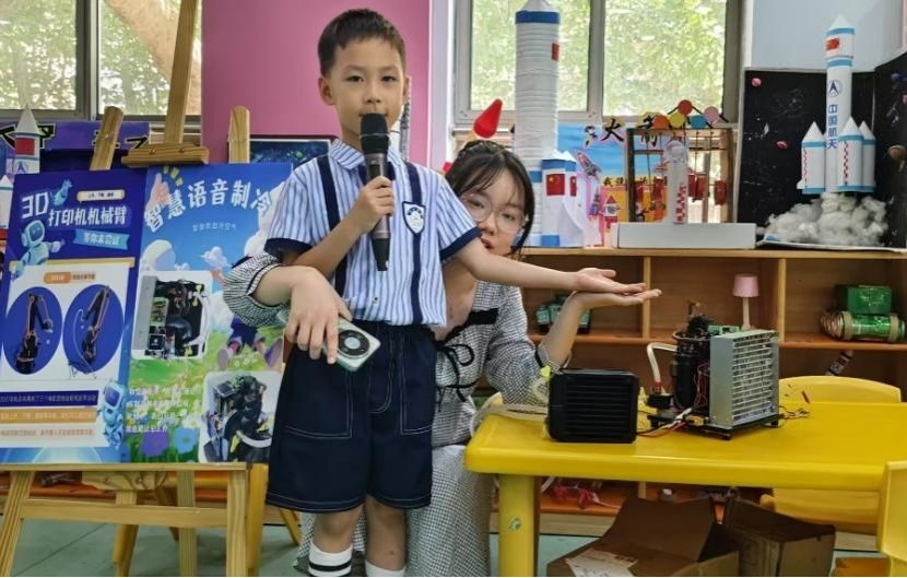 活动现场,同学们将专业知识转化为生动实践,展示了两件科技作品。志愿者陈文豪通过语音指令实现“智慧语音制冷机”的智能控制,引来了孩子们的阵阵惊叹。而志愿者王子墨展示的“3D打印机械臂”,让孩子们直观感受到联动装置的神奇与实用,志愿者引导孩子们观察机械传动原理,在动手拼接中感受工程之美。科普问答环节,志愿者祝月浩以“为什么机器人能听懂指令”为切入点,用生活化语言解密传感器与编程的奥秘,小朋友们踊跃举手,童趣与智慧碰撞出灿烂火花。